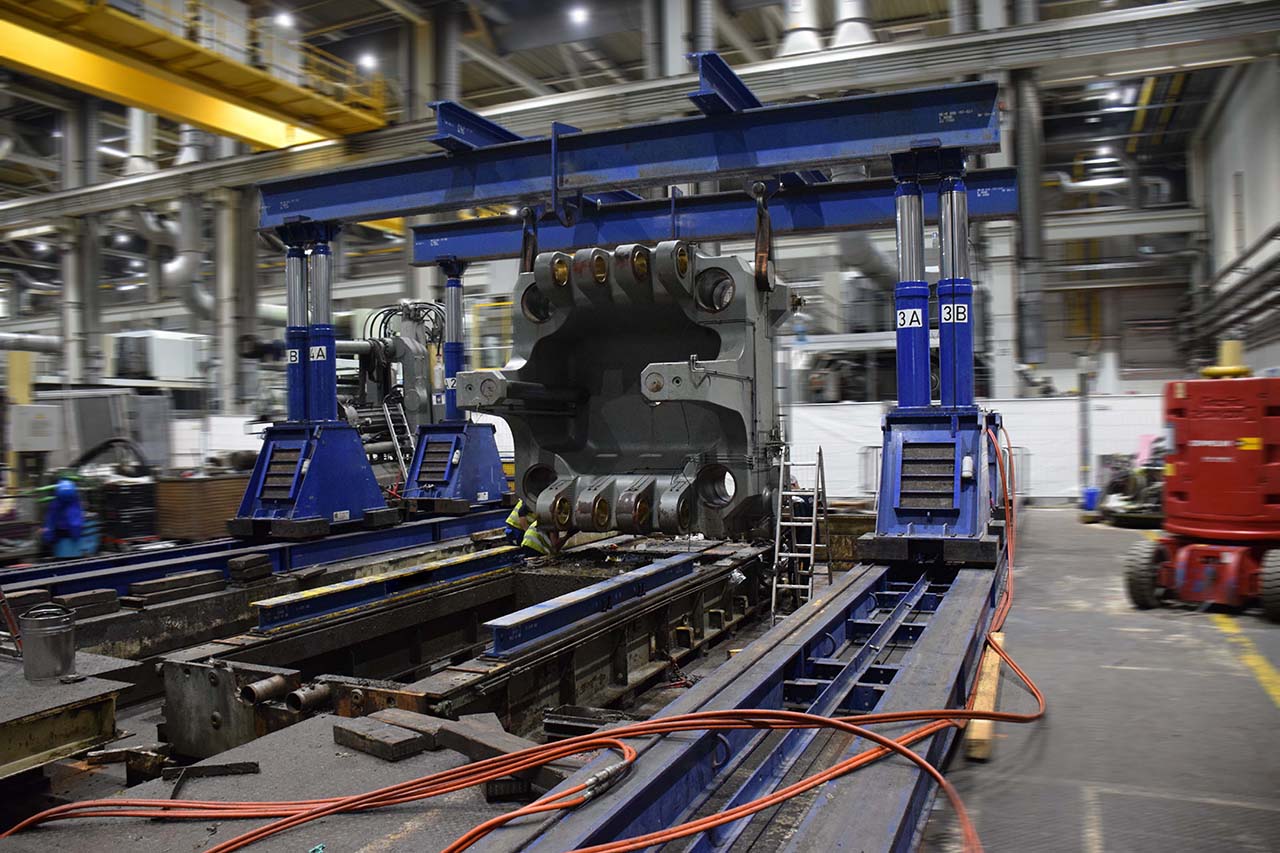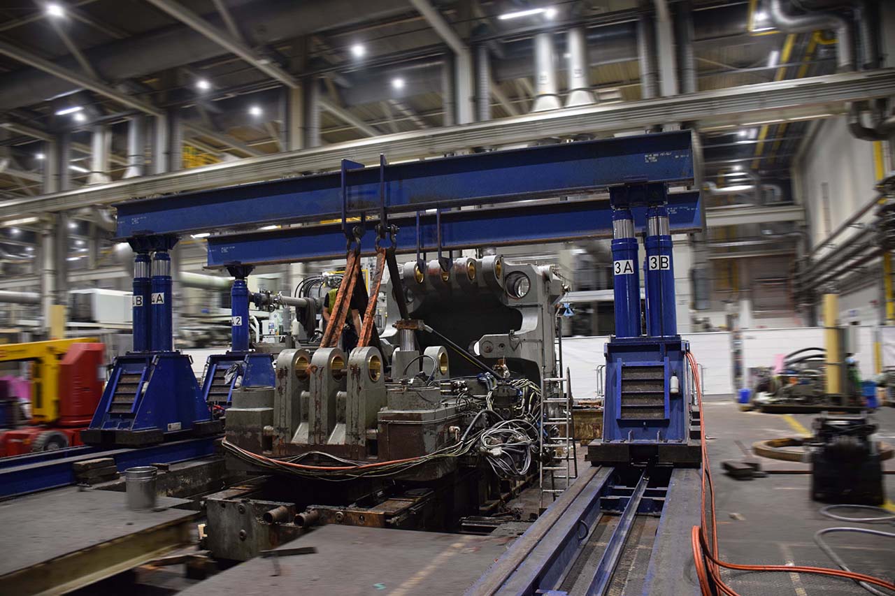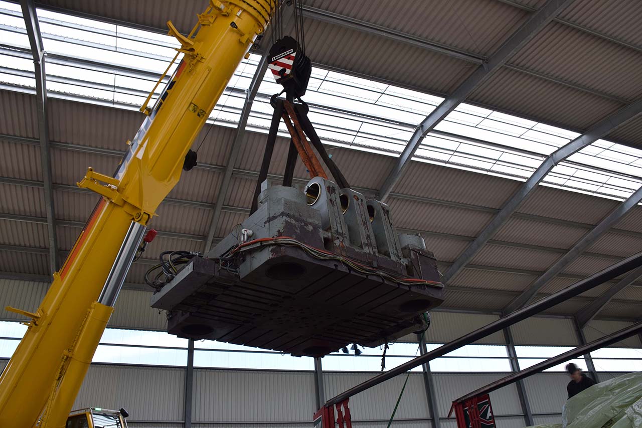 Ora era il momento della fase di pianificazione del complesso smantellamento e del trasferimento delle due celle di colata. Anche qui, fiss machines ha fornito un valido supporto con i suoi 30 anni di conoscenza specialistica. Insieme, sono stati analizzati i problemi specifici che potrebbero sorgere durante lo smontaggio e il trasporto e sono state elaborate soluzioni ragionevoli. Il percorso dalla sede della fabbrica presentava una sfida particolare. Il Bühler Evolution B 420 D ha un peso totale di 270.000 kg. Lo smontaggio e la rimozione dei pesanti componenti della macchina erano corrispondentemente difficili. La piastra cilindrica con un peso totale di 73.000 kg poteva essere spostata solo dopo che il vialetto con un seminterrato era stato assicurato con 100 puntelli per pavimenti.