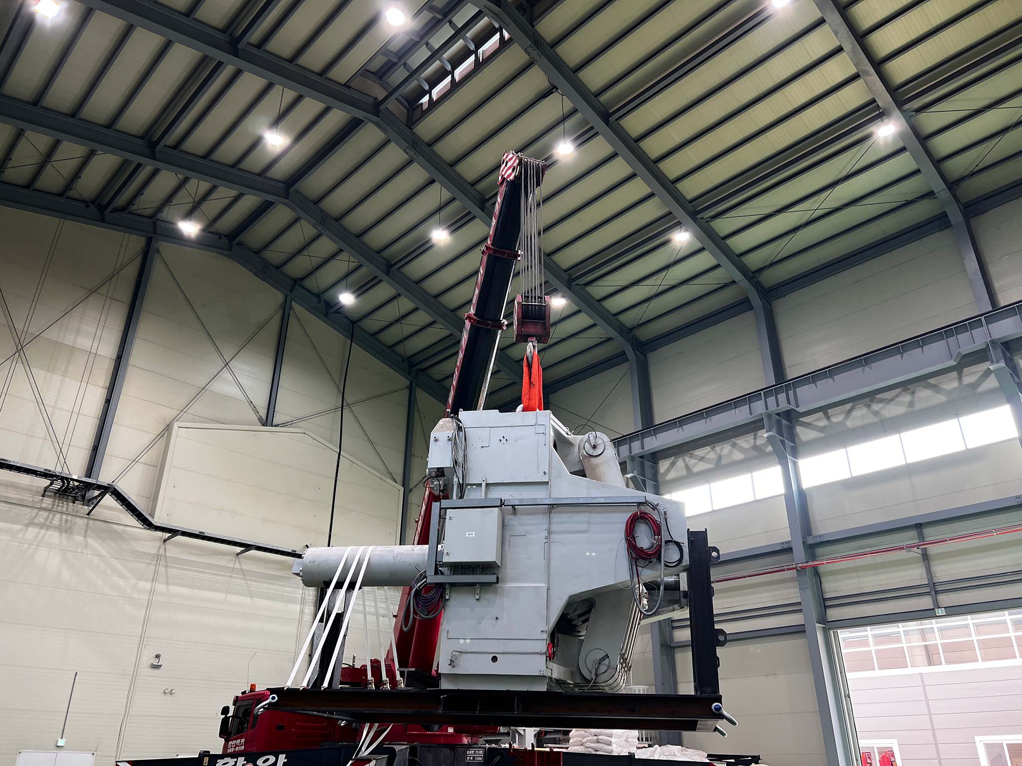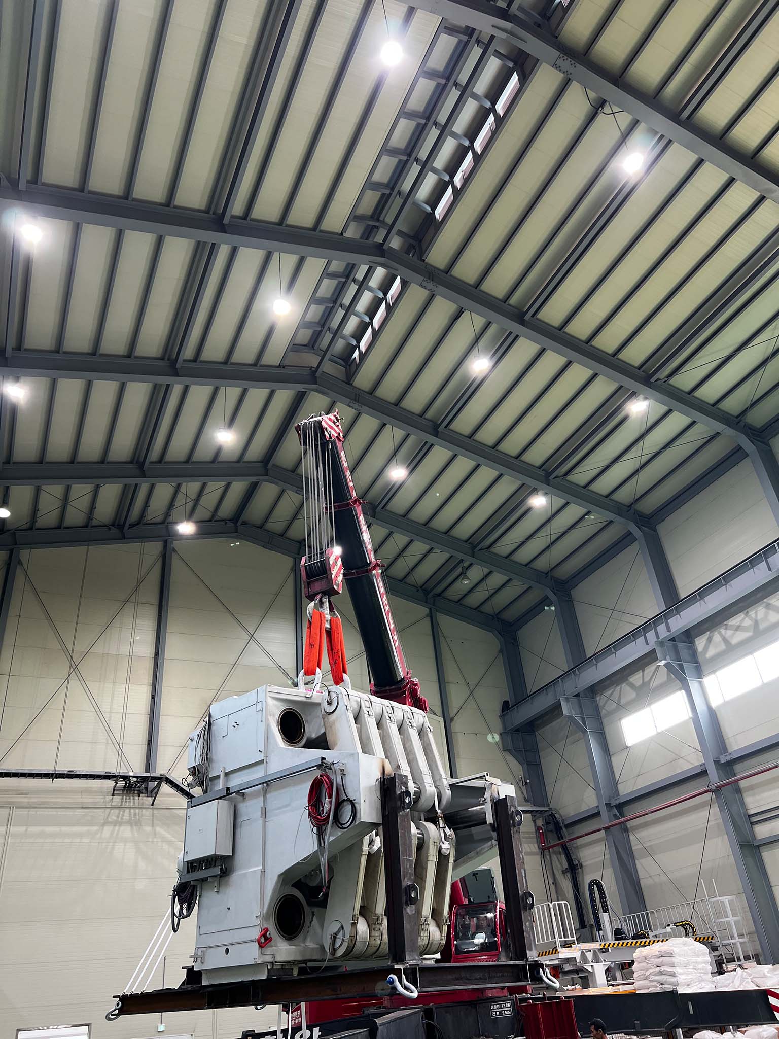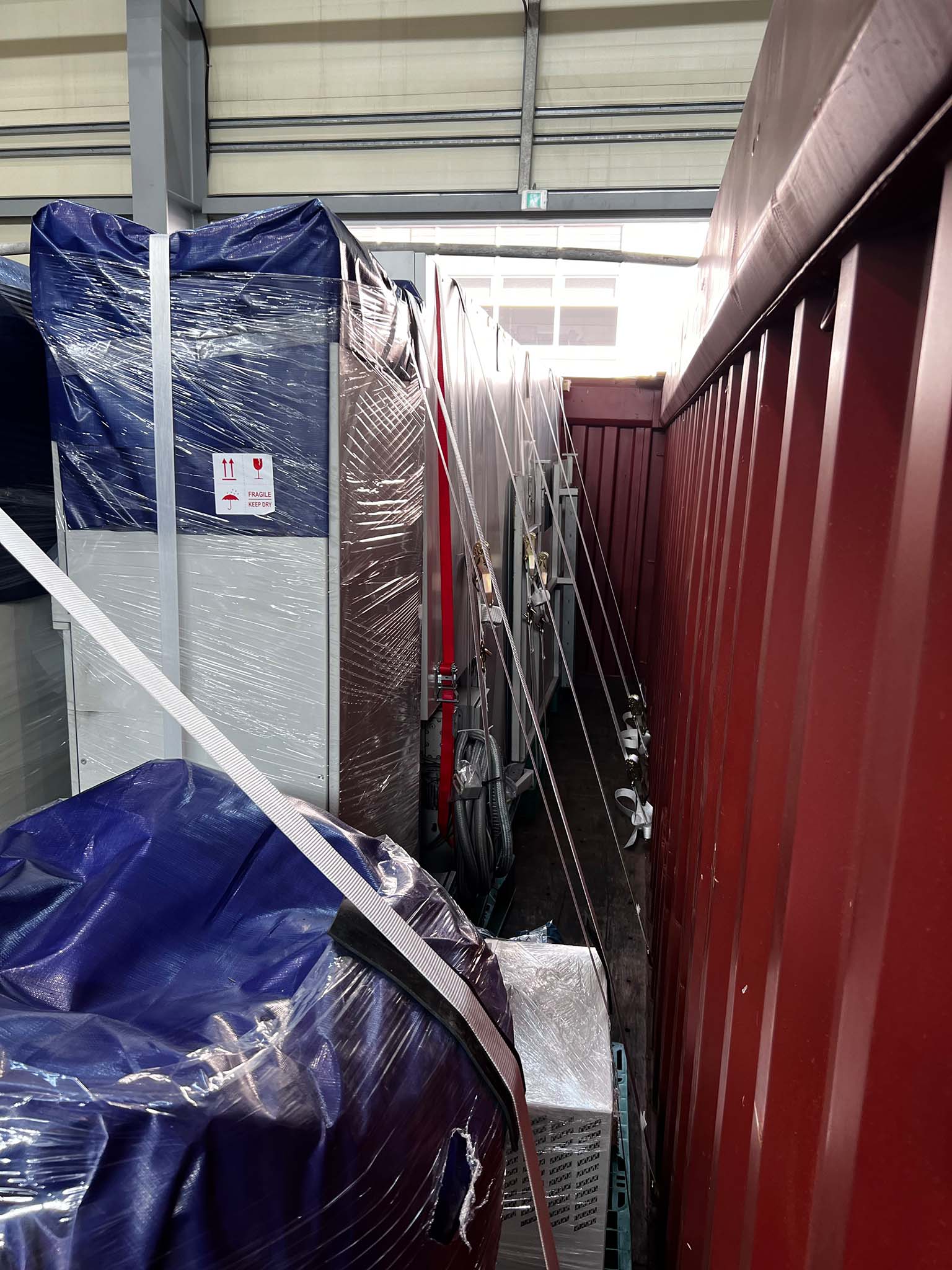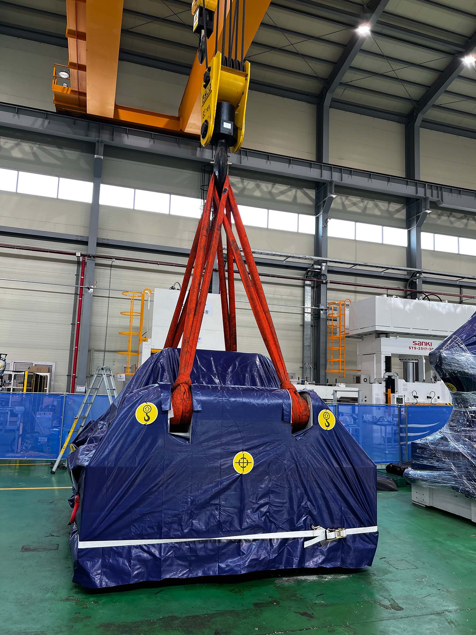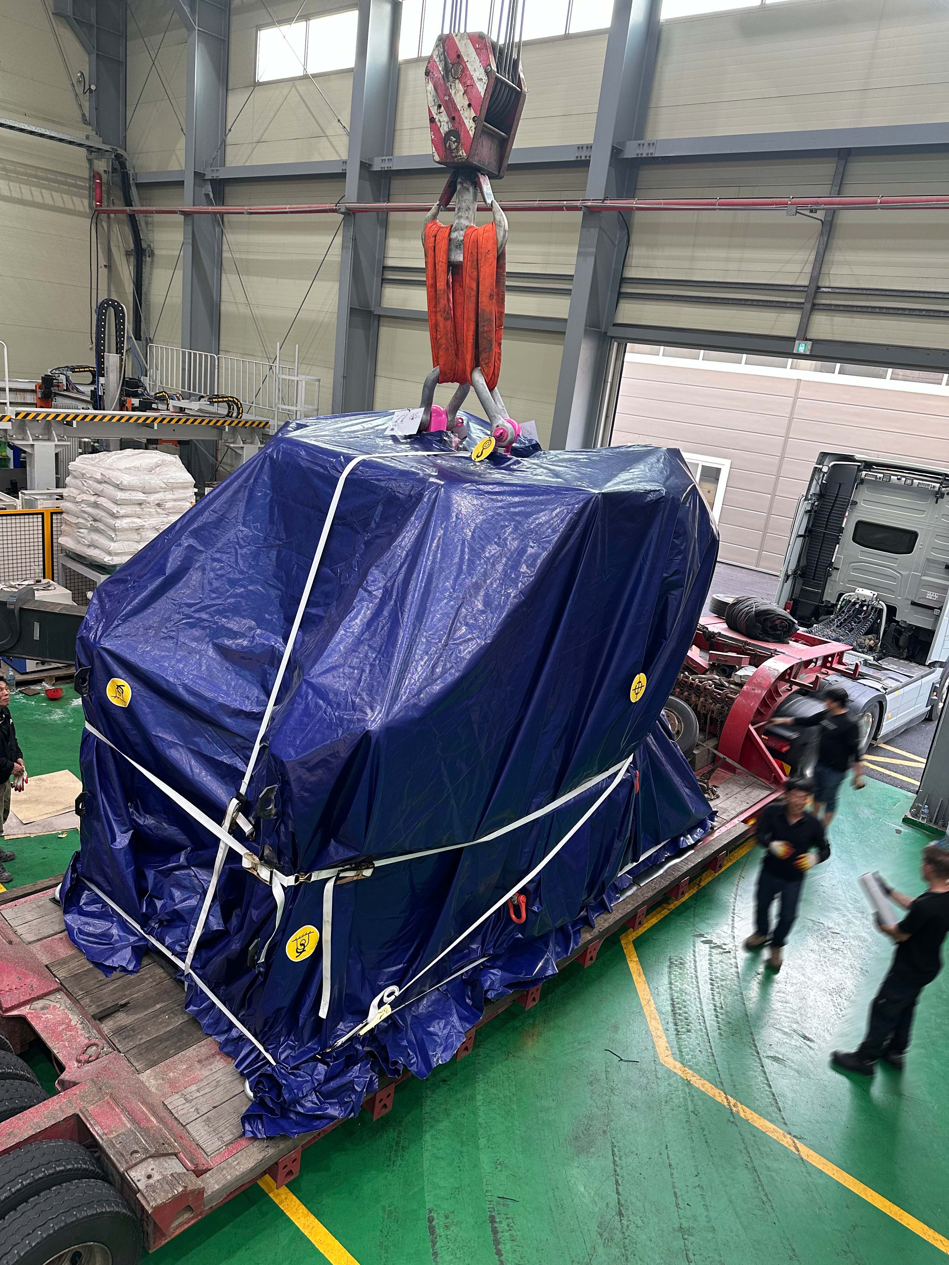 Dopo lo smontaggio, le singole parti della macchina sono state caricate in container speciali e su autocarri per carichi pesanti. Per garantire un trasporto sicuro, i componenti sono stati preparati e fissati in modo adeguato, in modo da soddisfare gli elevati requisiti del trasporto di carichi pesanti.