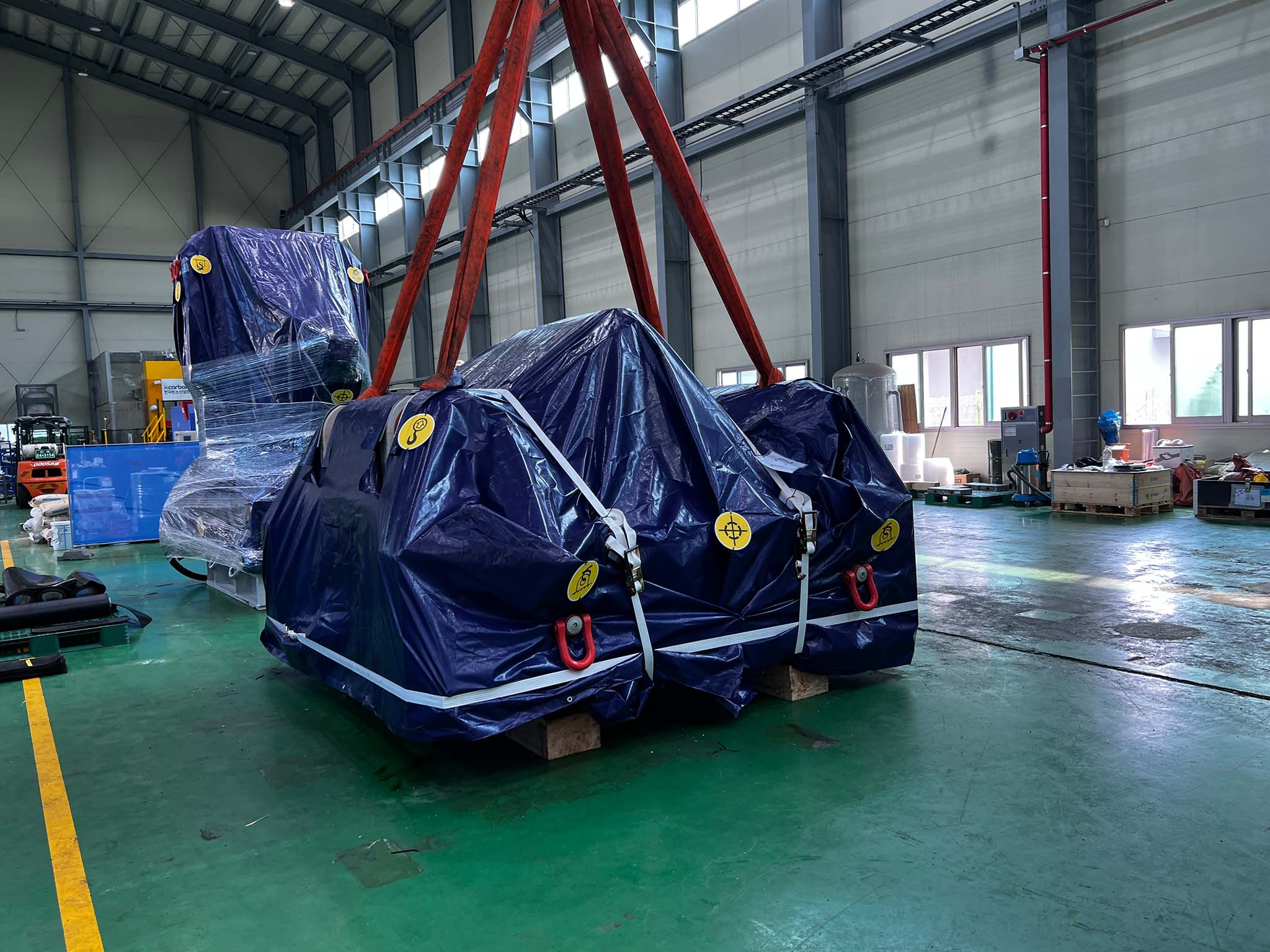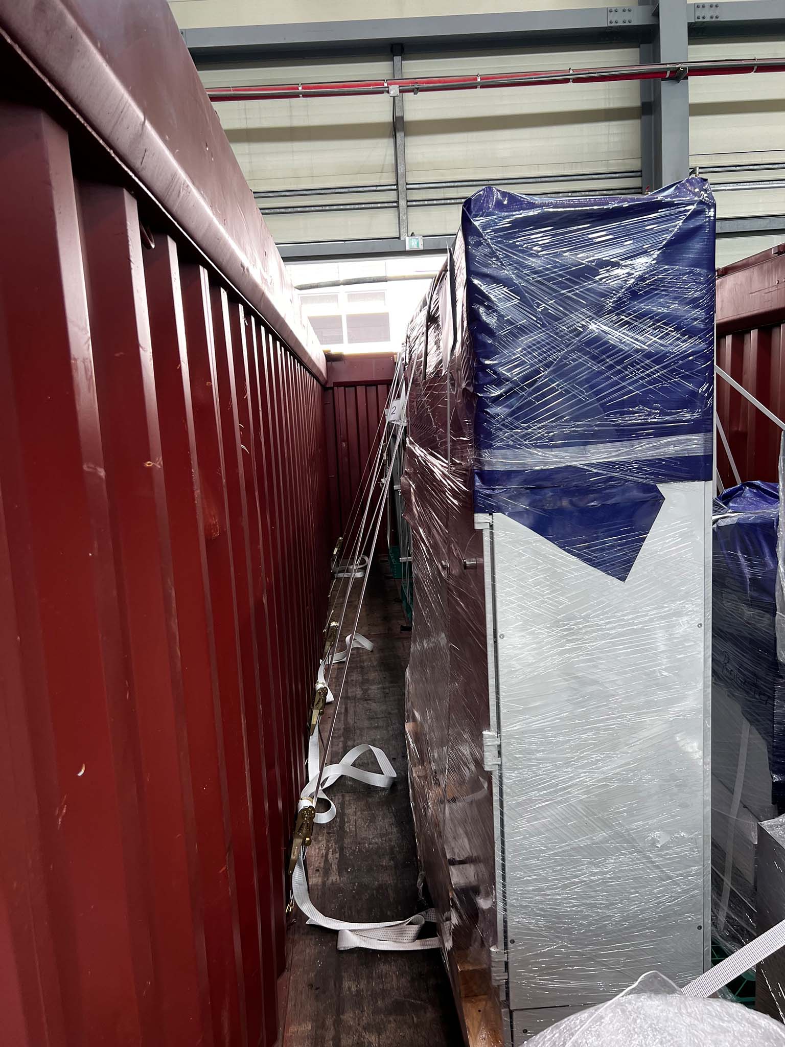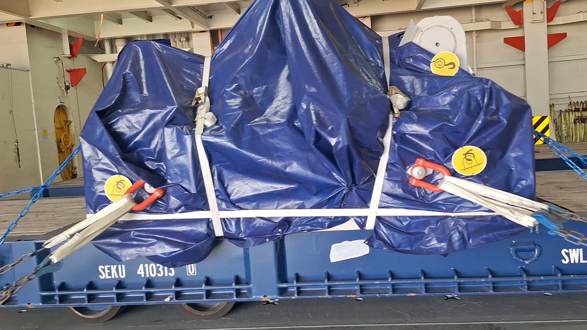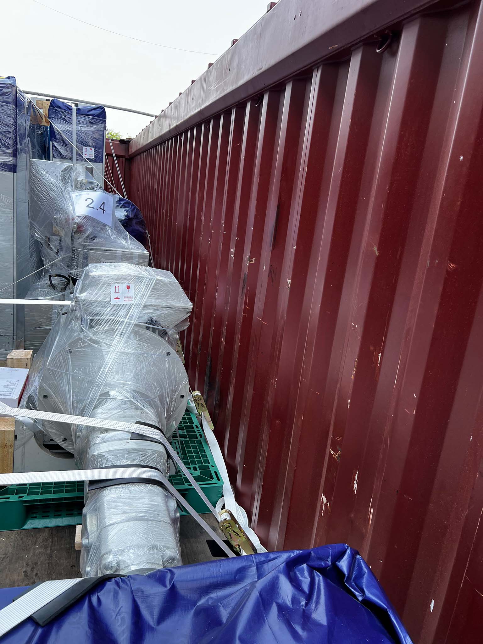 Dopo lo smontaggio, le singole parti della macchina sono state caricate in container speciali e su autocarri per carichi pesanti. Per garantire un trasporto sicuro, i componenti sono stati preparati e fissati in modo adeguato, in modo da soddisfare gli elevati requisiti del trasporto di carichi pesanti.